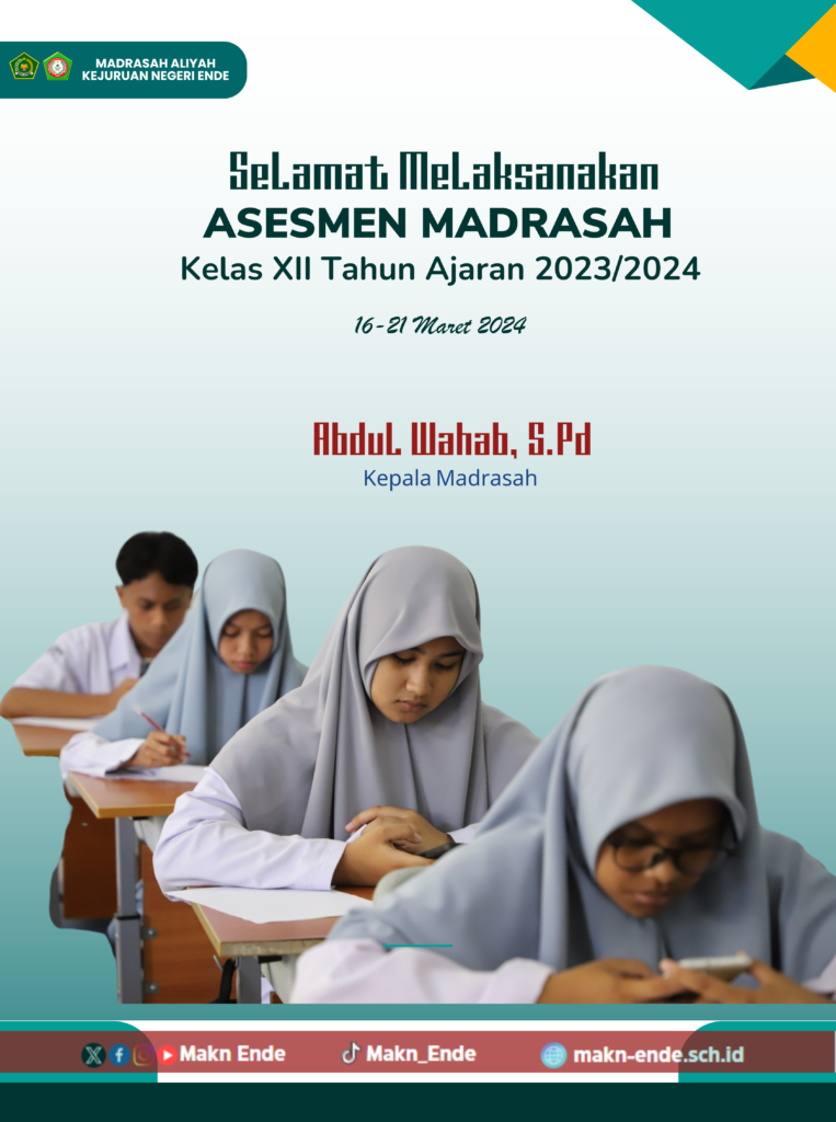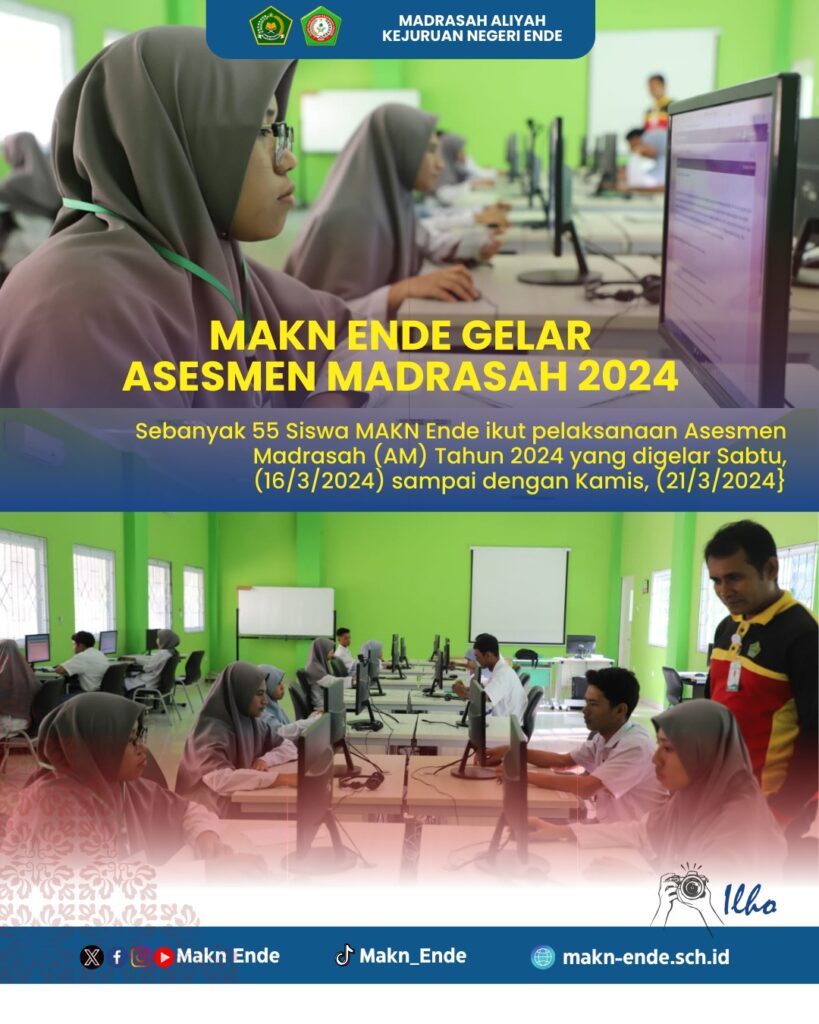 MAKN Ende (Humas)— Madrasah Aliyah Kejuruan Negri Ende menggelar Asesmen Madrasah (AM) Tahun 2024 bagi siswa madrasah kelas XII Jurusan Rekayasa Perangkat Lunak (RPL) dan Multimedia (MM) selama lima hari dimulai Sabtu, (16/3/2024) hingga Kamis, (21/3/2024) mendatang. Asesmen Madrasah (AM) ini merupakan pengganti Ujian Akhir Madrasah Berstandar Nasional (UAMBN) dan Ujian Nasional (UN).